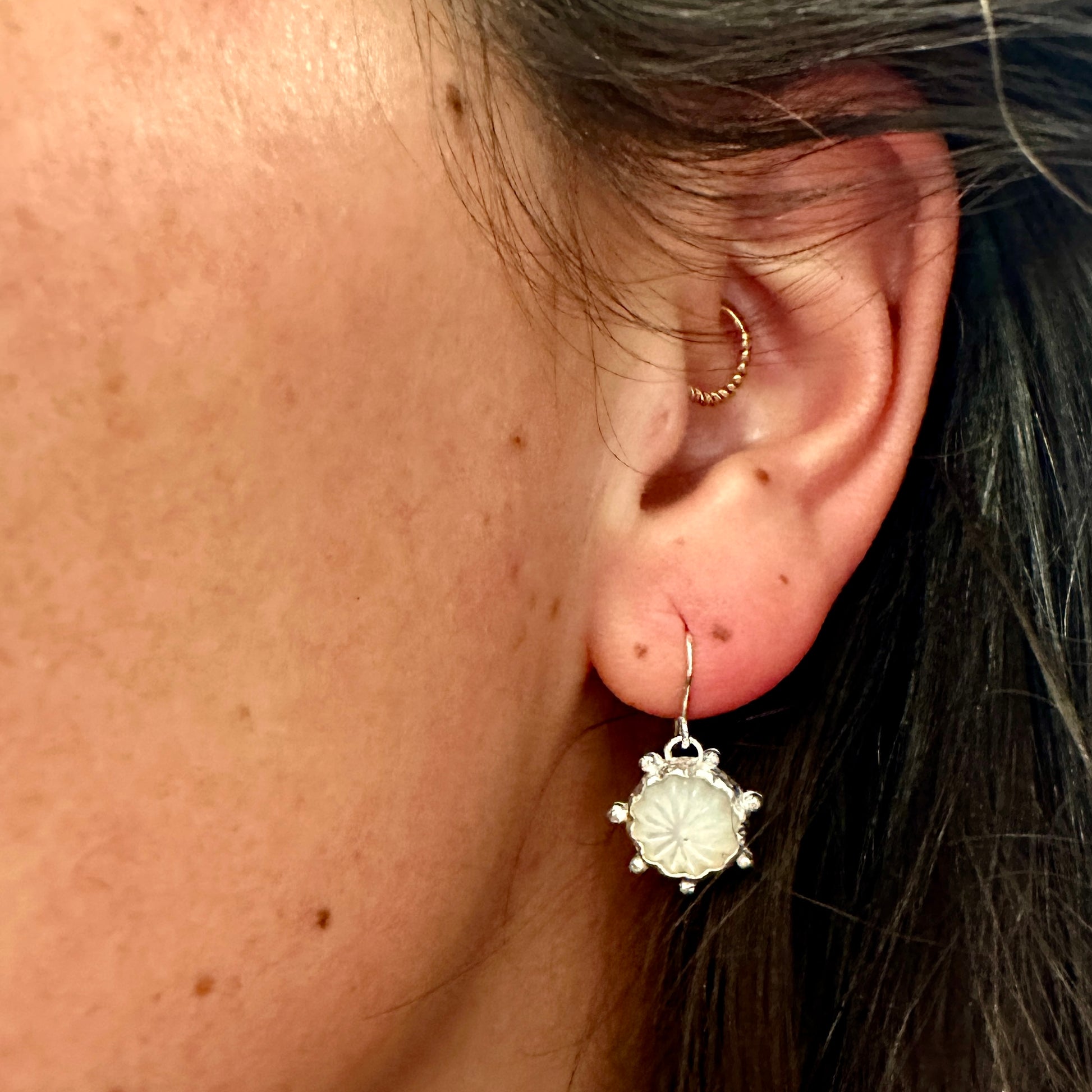 Dit paar zilveren oorhangers is handgemaakt en rijk aan textuur. Het handgesneden parelmoer vormt het middelpunt van het ontwerp.