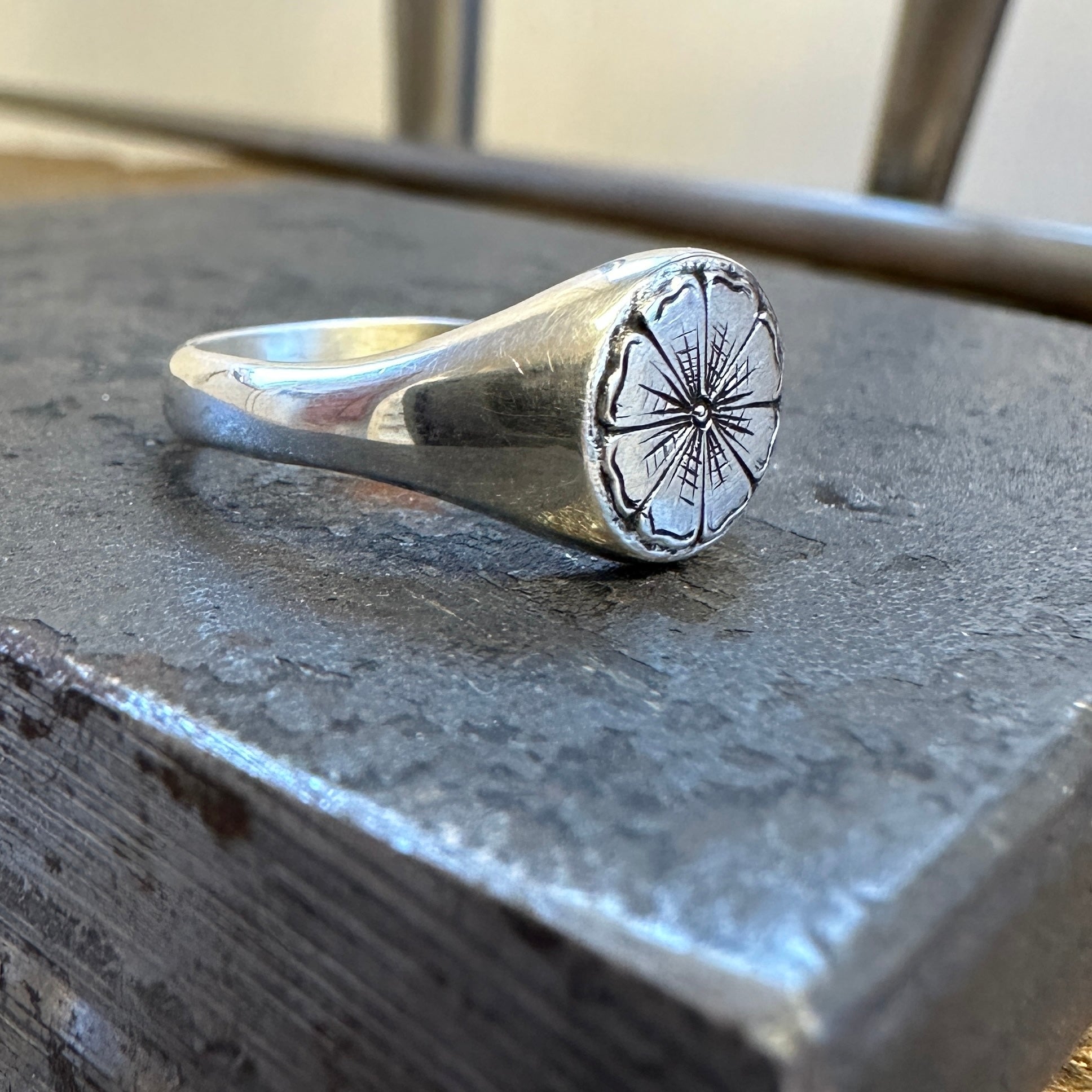 Deze zilveren signetring is met de hand vervaardigd en met precisie afgewerkt. Het vlak van de ring is voorzien van een handgravure van een bloemmotief. Deze is uitgevoerd met traditionele graveertechnieken. Elke lijn wordt afzonderlijk gesneden, waardoor een scherp, duurzaam en duidelijk zichtbaar reliëf ontstaat.